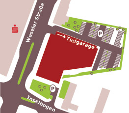 Über die Autobahnen A 1 und A 43 mit den Abfahrten Münster Nord und Süd sowie den Bundesstraßen B 219, B 51 und B 54 ist die Weseler Straße hervorragend zu erreichen. Dabei verliert der Standort nicht an Stadtnähe und bietet Erholungsraum durch Parks und Aasee. Parkmöglichkeiten gibt es auf den umliegenden Parkplätzen, dem Privatparkplatz hinter dem Haus und in der Tiefgarage. Gegenüber befindet sich das Hauptgebäude der Sparkasse Münsterland Ost, ebenfalls in der Nähe befindet sich die WGZ Bank, WL-Bank, DHK, LVM, etc. Essensangebote mit Kantine können genutzt werden.